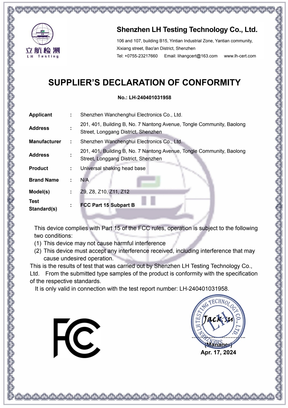 LH-240401031958-深圳市晚成辉电子-摇头底座-FCC报告