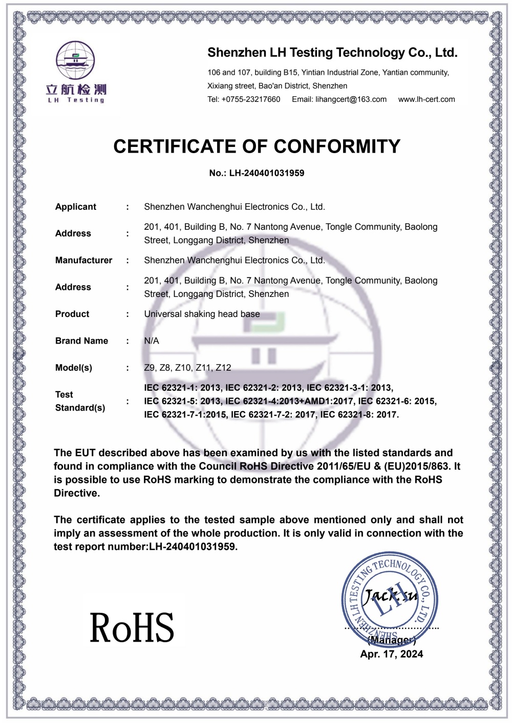 LH-240401031959-深圳市晚成辉电子-摇头底座-ROHS2.0报告
