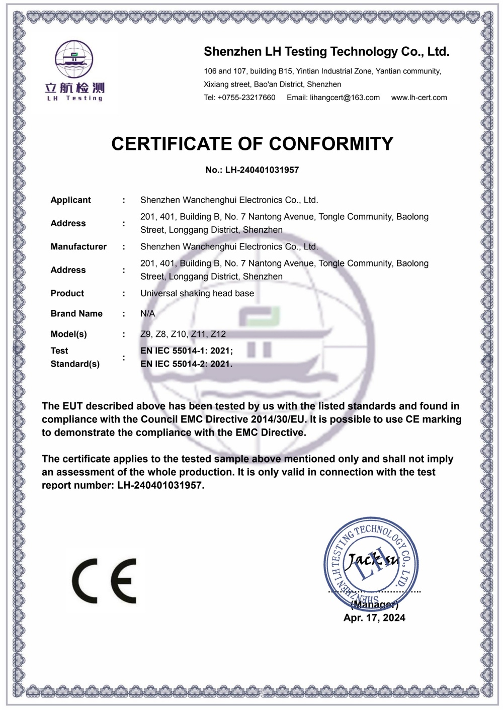 正式件-深圳市晚成辉电子-摇头底座CE,RoHS,FCC